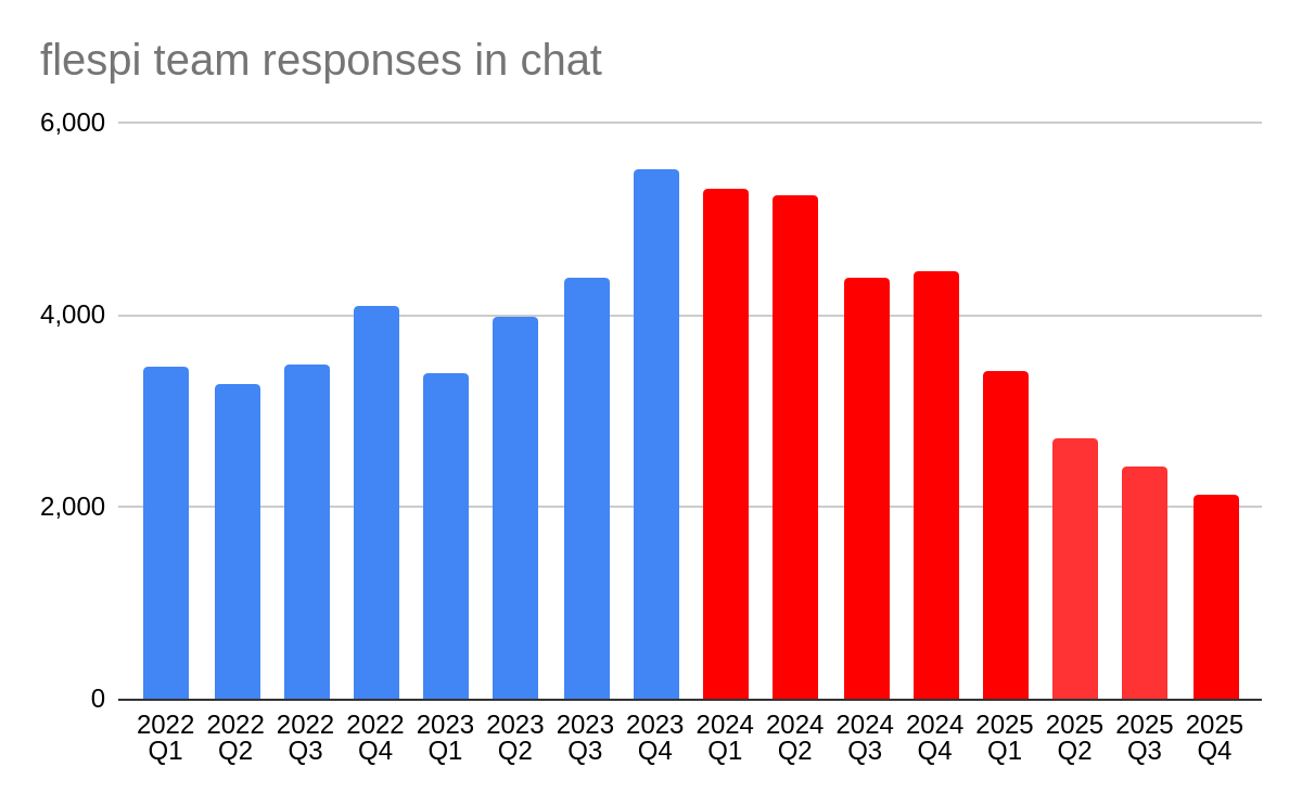 However, the most important point is not the sheer number of AI responses, but the fact that, despite a rapidly growing user base and increasing complexity of the telematics projects we’re involved in, the actual load on the human part of the team has significantly decreased. On the chart below, you can see how the introduction of AI affected the number of messages sent by human engineers: