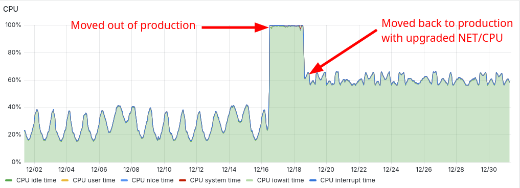 It took quite some time to order, set up, and install everything, but finally, we were able to address the second incident of this year and dissolve the critical network segment by upgrading uplinks with bonded interfaces. With this change, a similar failure should now be a non-event for us. This was achieved through CPU and networking hardware upgrades on our data center routers, which also resulted in a noticeable reduction in packet routing load: