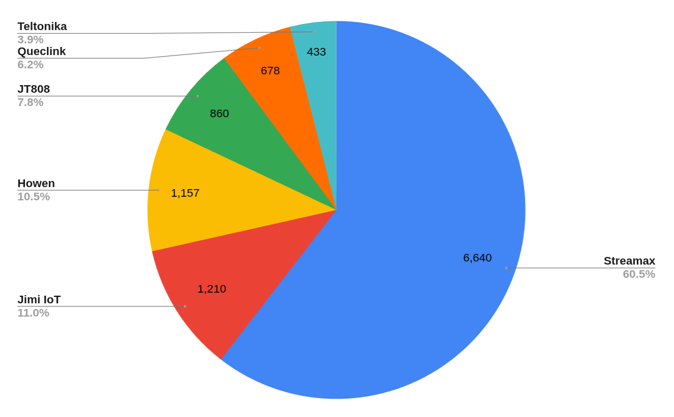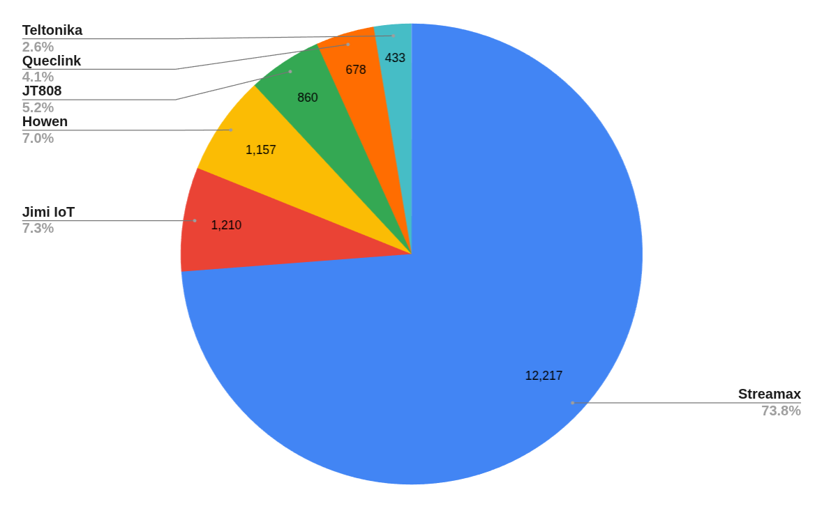 Overall, video telematics devices show a wide range of maturity levels – from stable, well-documented implementations to powerful hardware with configuration-heavy or firmware-driven limitations. The pie chart shows the brands aligned by the number of connected devices: