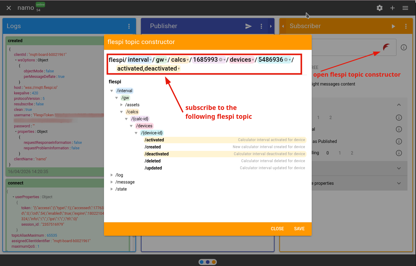 The flespi topic constructor button opens a handy tool that allows to navigate trough publicly available flespi MQTT topics and helps user to build a desired flespi topic to subscribe to (for connections to the flespi MQTT broker only):